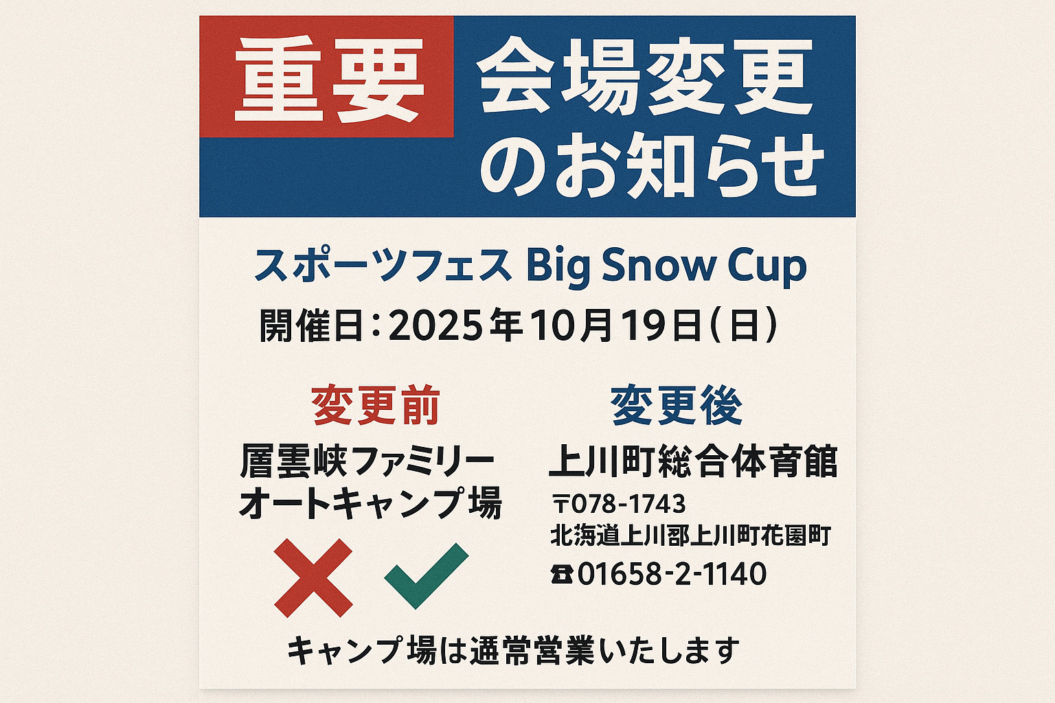 2025年10月19日(日曜日)に開催予定のスポーツフェス「Big Snow Cup」につきまして、会場を変更させていただくこととなりました。